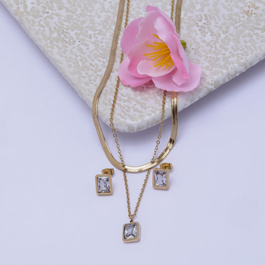 White Crystal 18K Gold Plated Multi-Layer Necklace with Earrings