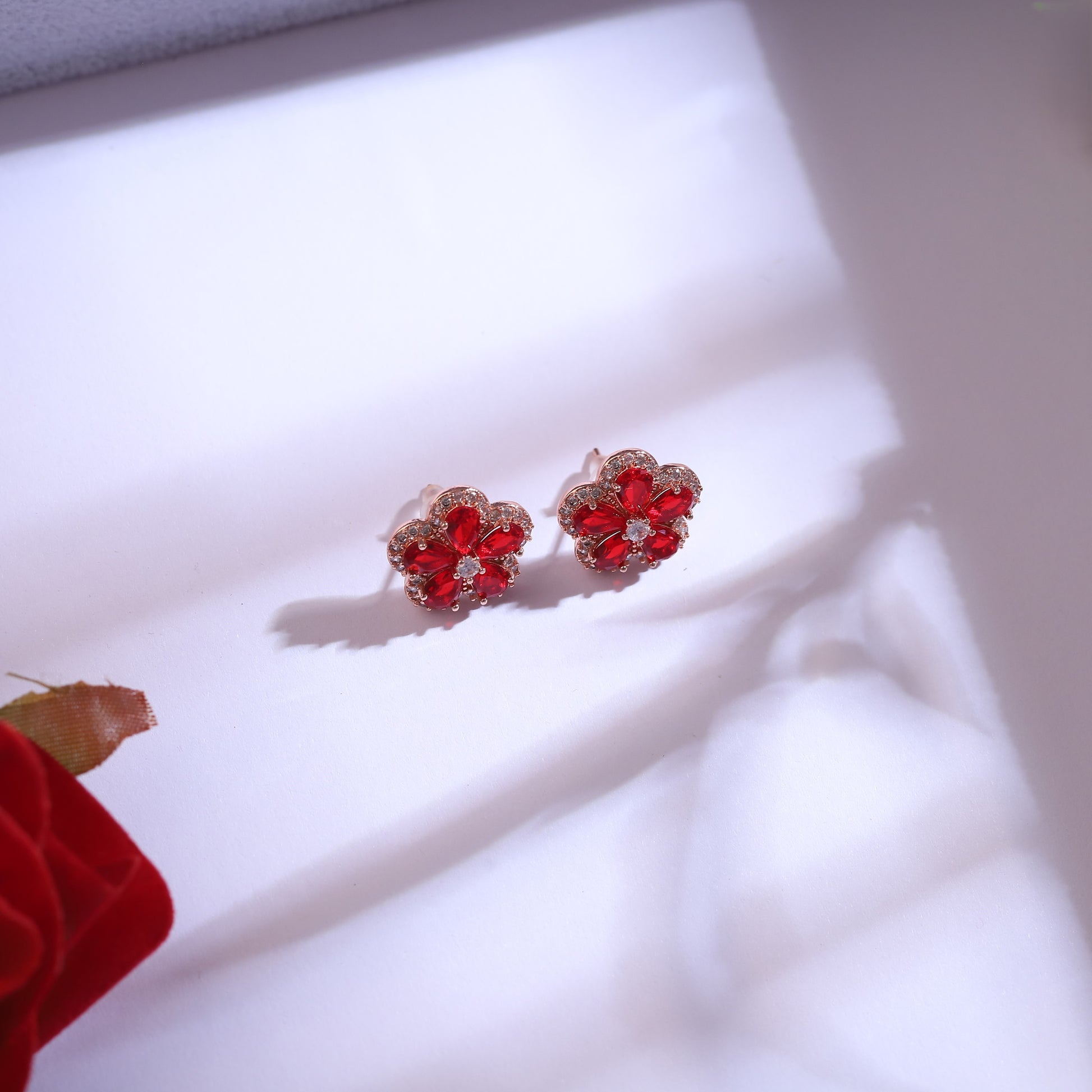 Unleash your inner romantic with the Rosalia Radiance Set, where elegance meets vibrance. Crafted in a rich rose gold plating, this set features a blooming floral design adorned with vivid red gemstones and shimmering crystal accents. The intricately designed pendant and matching studs exude charm, passion, and grace—making it the perfect accessory for festive evenings, romantic dates, or gifting someone special. Hypoallergenic, fade-resistant, and forever captivating.