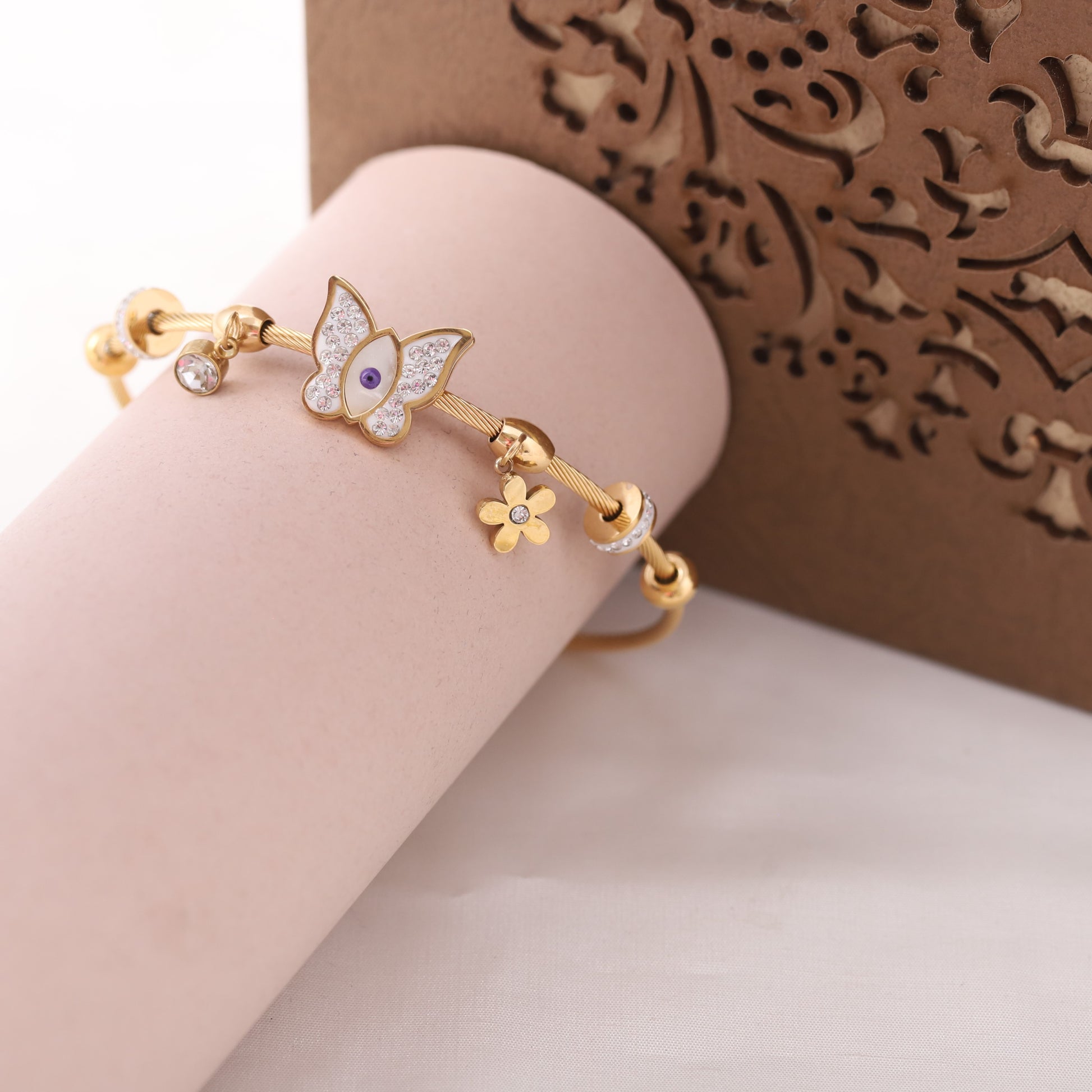 This charming gold-toned flexible bangle features a delightful crystal-paved bunny charm with an intriguing evil eye detail, accompanied by a sweet petite flower charm. Crafted with hypoallergenic, anti-tarnish, sweat-proof, and waterproof materials, it offers enduring brilliance and a playful yet sophisticated touch for any occasion.