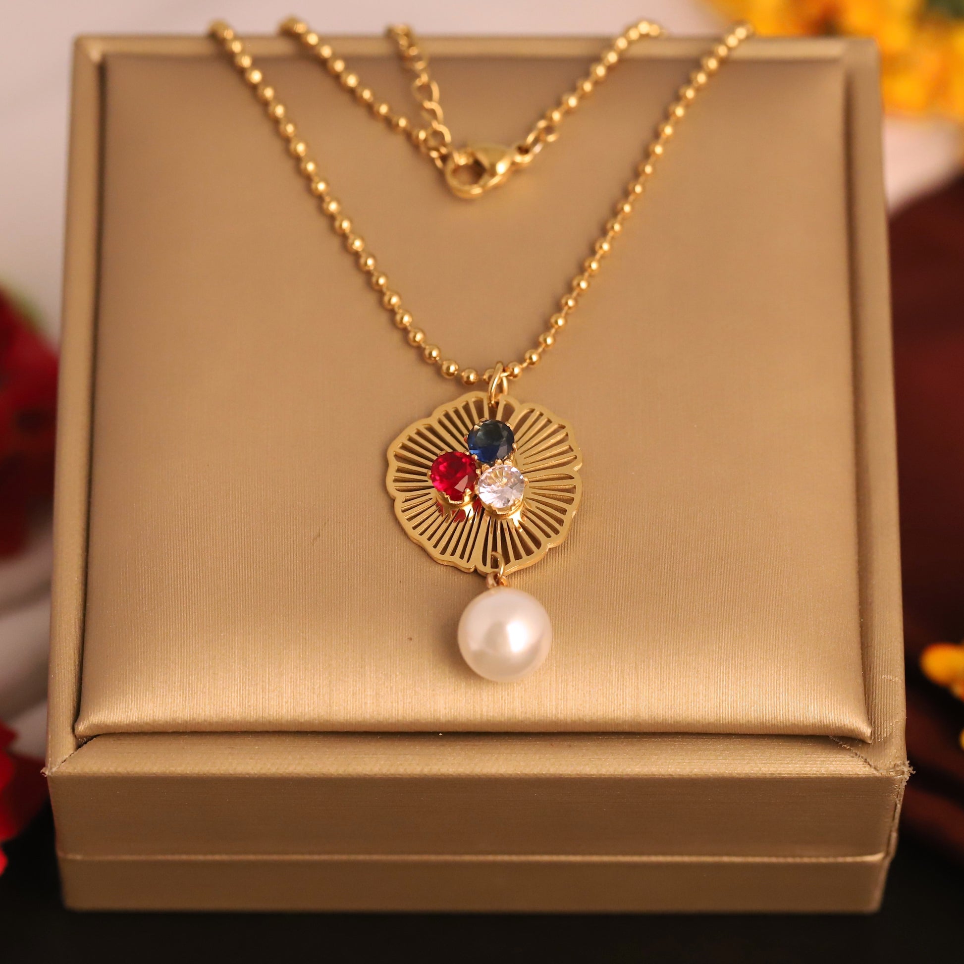 This exquisite piece features a unique, intricately cut petal or fan-shaped gold pendant, beautifully adorned with three vibrant, colorful gemstones (red, blue, and clear) at its center, and finished with a luminous dangling pearl. Crafted with hypoallergenic, anti-tarnish, sweat-proof, and waterproof materials, it offers enduring brilliance and a captivating blend of elegance and playful charm for any occasion.